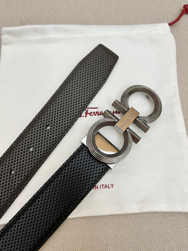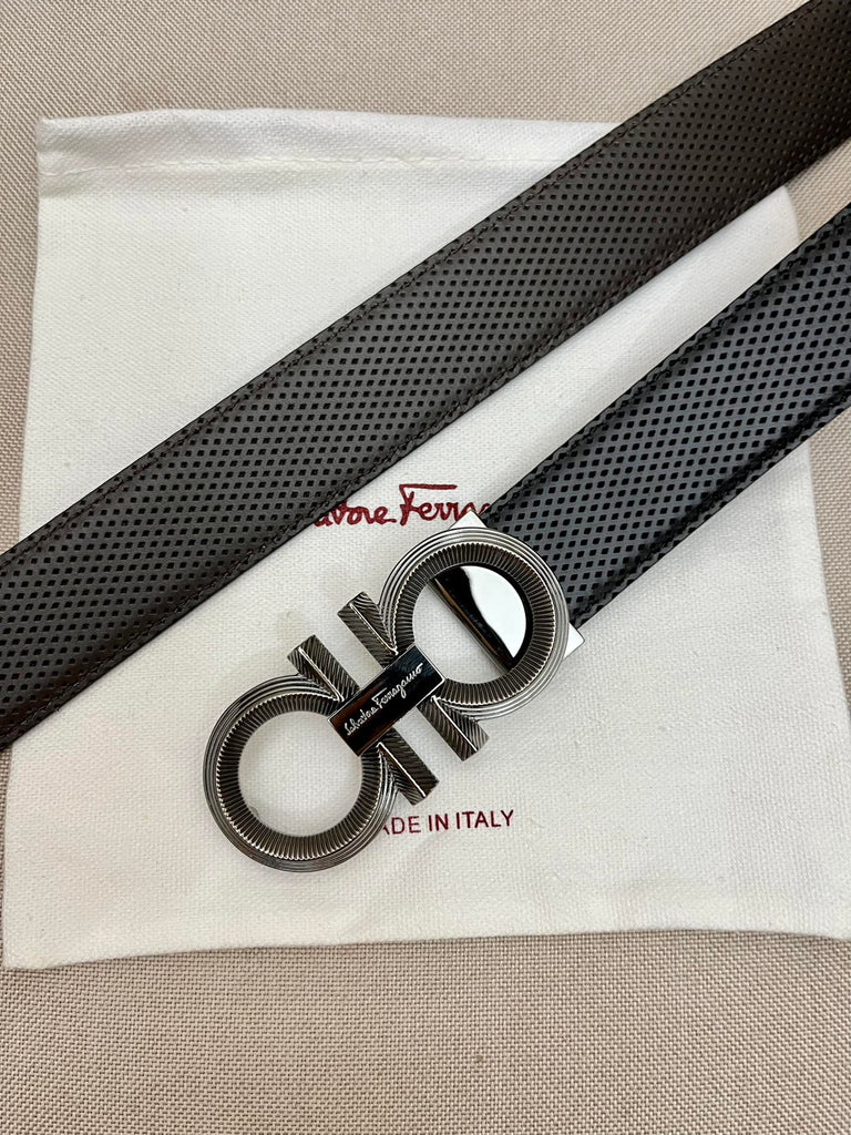 Este cinturón, uno de los diseños más codiciados de la marca, ha sido renovado con un toque vibrante. Un lado del cinturón luce piel de becerro de colores brillantes. Esta pieza, de gran versatilidad, se cierra con una hebilla pulida que complementa la estética moderna del accesorio.
